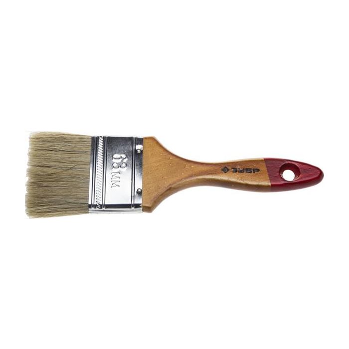 Плоская кисть предназначена для нанесения лакокрасочных материалов. Специальное отверстие в деревянной рукоятке, позволяет удобно хранить инструмент, подвесив его в вертикальном положении.