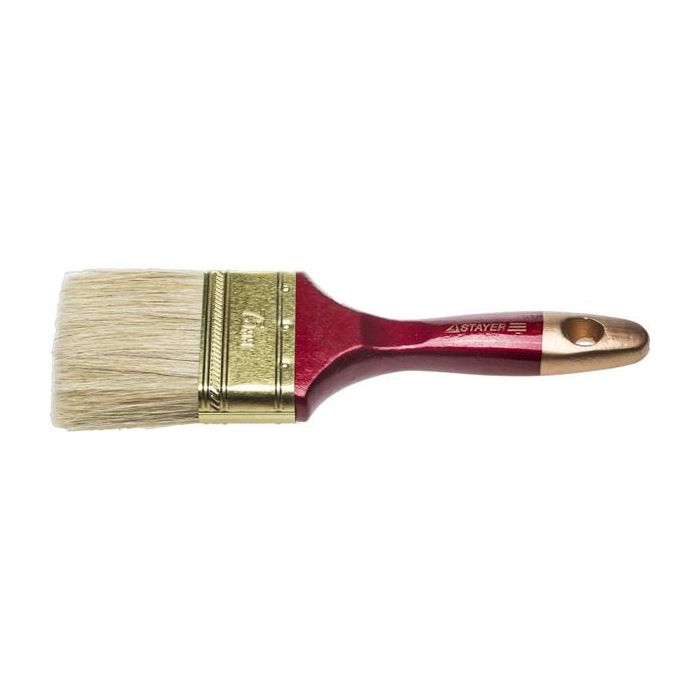 Кисть плоская предназначена для нанесения лакокрасочных изделий на различные поверхности. Натуральная щетина кисти хорошо впитывает лак или краску, равномерно распределяя их по обрабатываемой поверхности. Также щетина охвачена металлическим бандажом и дополнительно проклеена, что не позволяет щетинкам рассыпаться или осесть на окрашенном участке поверхности. Размер кисти составляет 75 мм.