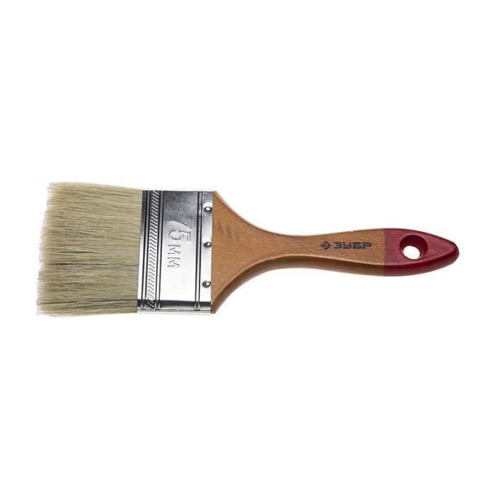 Плоская кисть предназначена для нанесения лакокрасочных материалов. Специальное отверстие в деревянной рукоятке, позволяет удобно хранить инструмент, подвесив его в вертикальном положении.