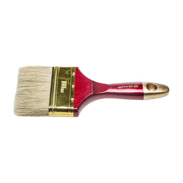 Кисть плоская предназначена для нанесения лакокрасочных изделий на различные поверхности. Натуральная щетина кисти хорошо впитывает лак или краску, равномерно распределяя их по обрабатываемой поверхности. Также щетина охвачена металлическим бандажом и дополнительно проклеена, что не позволяет щетинкам рассыпаться или осесть на окрашенном участке поверхности. Размер кисти составляет 100 мм.