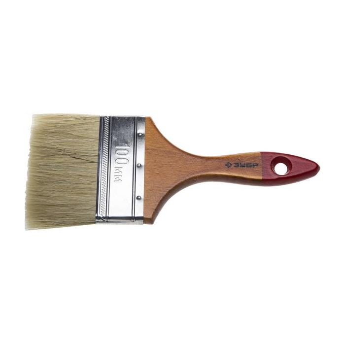 Плоская кисть предназначена для нанесения лакокрасочных материалов. Специальное отверстие в деревянной рукоятке, позволяет удобно хранить инструмент, подвесив его в вертикальном положении.