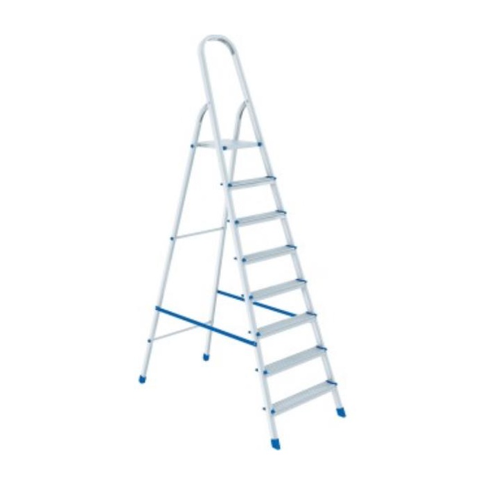 Лестница представляет собой облегченную складную модель, состоящую из 8 ступенек. Материал изделия - высокопрочный алюминий. Широкие профилированные противоскользящие ступени. Имеет широкое устойчивое основание, высокую дугу безопасности, защищающую от падения.