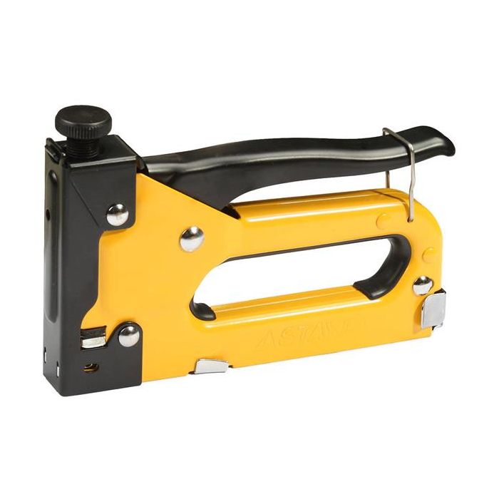 Степлер мебельный изготовлен из хромированной стали. Оснащен регулируемым механизмом контроля силы удара и глубины забивания. Для степлера подходят скобы тип 53 4-14 мм. Используются во время выполнения столярных работ для крепления материала из гипсокартона, пластика, ДСП и других схожих материалов, к другим различным поверхностям.