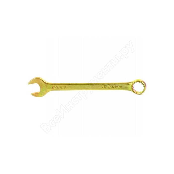 Ключ гаечный комбинированный 24 мм изготовлен из углеродистой стали. Твердость материала рабочей части ключа 42 HRc. Покрытие – желтый цинк. Профиль кольцевого зева имеет 12 граней, что увеличивает площадь соприкосновения рабочих поверхностей и снижает риск деформации граней крепежа при монтаже. Угол наклона кольцевого зева относительно плоскости ключа в 15 градусов делает монтаж более удобным.
