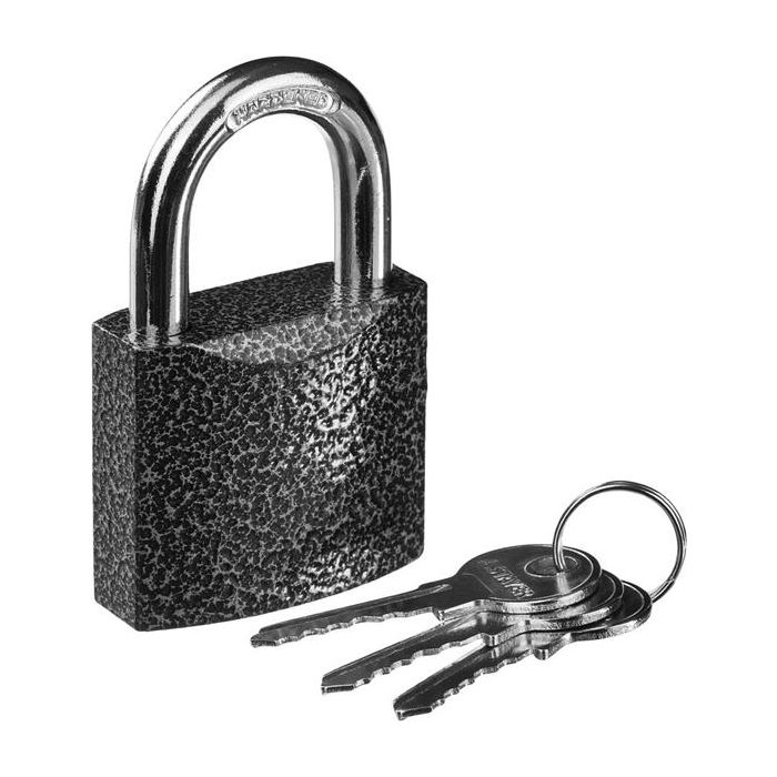 Замок навесной, металлический корпус, закаленная дужка. Предназначен для запирания хозяйственных помещений, гаражей, складов, подвалов .