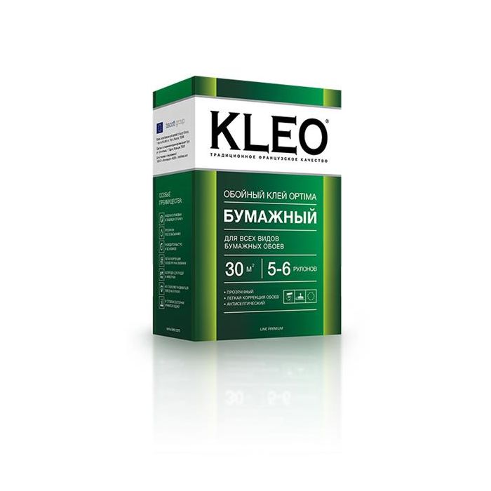 KLEO Optima бумажный предназначен для наклеивания всех видов бумажных обоев. Объем упаковки - 120 гр., на 5-6 рулонов.