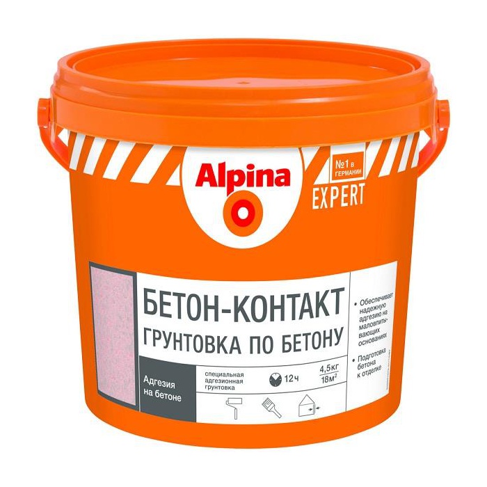 Alpina EXPERT Бетон-Контакт за небольшое количество этапов работ позволяет достичь превосходных результатов. Этот материал — мечта и мастера-профессионала, и домашнего умельца, ведь эта водно-дисперсионная грунтовка уже готова к применению и создаёт исключительную основу для оштукатуривания или шпатлевания плотных, гладких, не впитывающих или слабовпитывающих оснований.
