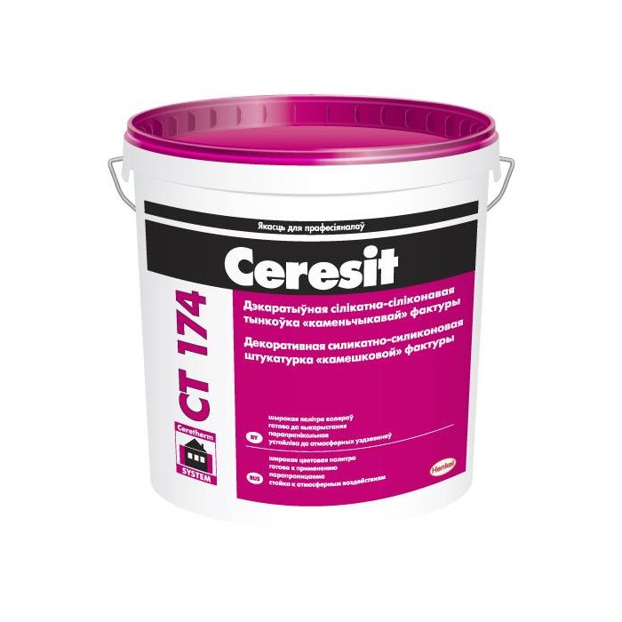 Ceresit CT 174 сочетает в себе достоинства силикатных и силиконовых штукатурок. Обладает паропроницаемостью, низкой впитываемостью, а так же стойкостью к загрязнениям.