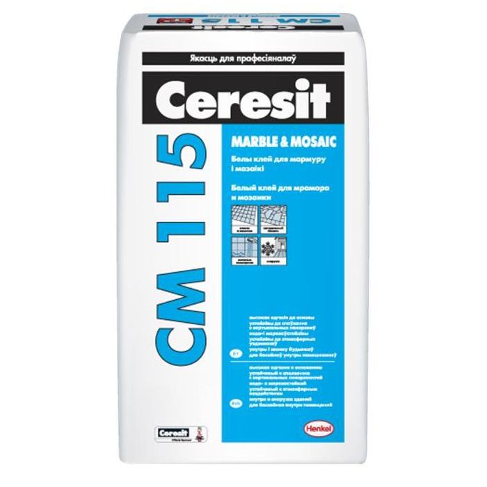 Смесь Ceresit CM 115 предназначена для облицовки бетонных, кирпичных, цементно-песчаных или цементно-известковых поверхностей и других оснований плитами из мрамора и других светлых пород природного камня, а также мозаичными плитками, в т.ч. стеклянными.